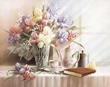 Title: Teapot And Iris. Artist: T.C. Chiu. Image Size: 28.00in. x 22.00in. Paper Size: 28.00in. x 22.00in. Beautiful MUSEUM WRAP CANVAS Print with Added BRUSHSTROKESThe Canvas Transfer Process